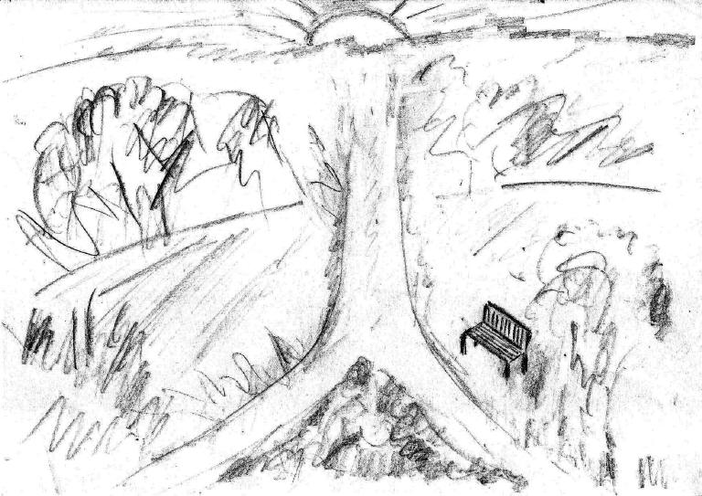 der Wege, wo diese verschmelzen und eine Bank wartet. Nachdem sie sich